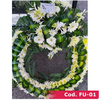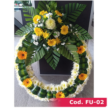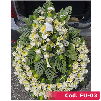 Corona mediana de 65 cms con masageanas y gerberas flores blancas y flores de complemento y tarjeta hecha y escrita a mano Q435 + envio