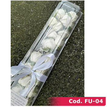 Rosario de 24 rosas en una caja transparente y tarjeta hecha y escrita a mano
