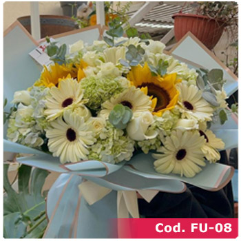 Ramo de 24 rosas con 2 girasoles y 10 gerberas con hortensias y papel decorativo