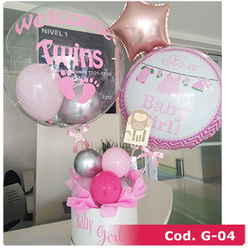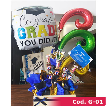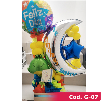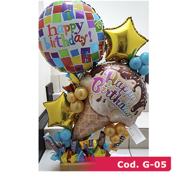 Arreglo con 2 globos metálicos No. 18” y figura de 22”, un globo número 9.5”, 4 chocolates medianos y 2 pequeños (los que hay stock, no se puede escoger) en una base de madera, papel de china decorativo y tarjeta hecha y escrita a mano