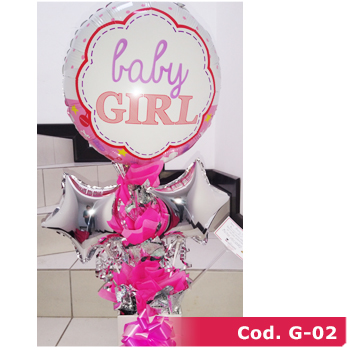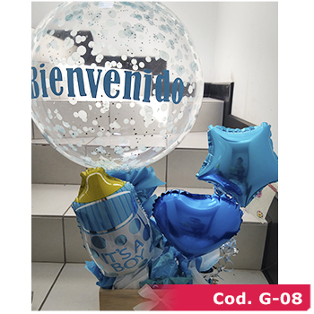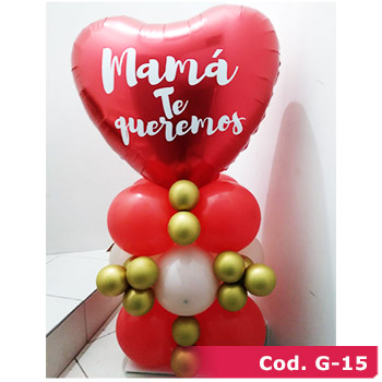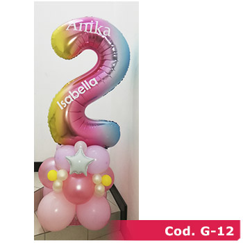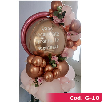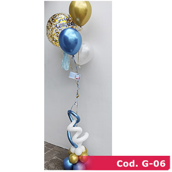 Arreglo de globoflexia con dos globos metálico numero 32 o 40 (el tamaño que esté disponible) base de globo de látex de diferentes tamaños y 5 globos de latex No. 12” con helio y tarjeta hecha y escrita a mano. Los globos de latex solo duran 8 horas flotando