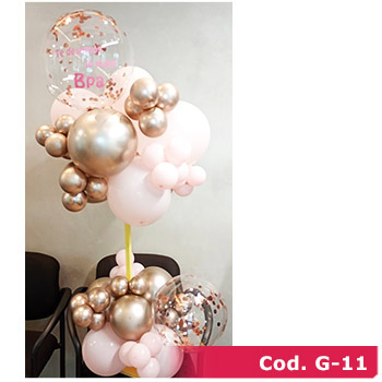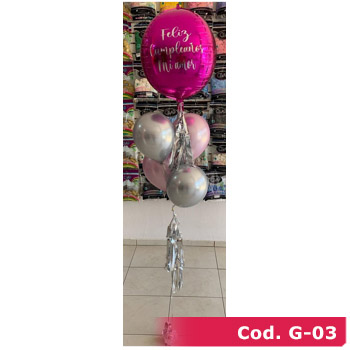 Ramillete de 1 globo metalico personalizado con 34globo de latex de diferentes tamaños amarrados en una base de peso decorada con globos de latex y tarjeta hecha y escrita a mano. El globo metálico solo duran 2 dias flotando con el helio y los globos de latex solo duran 8 horas flotando