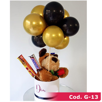 Caja redonda blanca personalizada con arreglo de globos con 1 peluche, 2 chocolates, 1 rosa artificial y tarjeta con su mensaje (A mano).