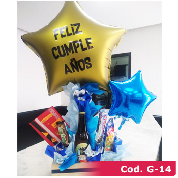 Caja de madera con 1 globo de 18", 1 globo de 9", 1 cerveza gallo u otra marca, 2 chocolates grandes, 1 bolsa de manias, tarjta con su mensaje (A mano).