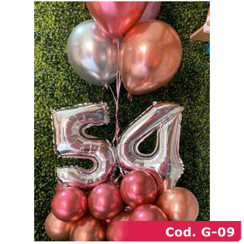 Arreglo de globoflexia con un globo metálico personalizado numero 32 o 40 (el tamaño que este disponible) base de globo de látex de diferentes tamaños y tarjeta hecha y escrita a mano